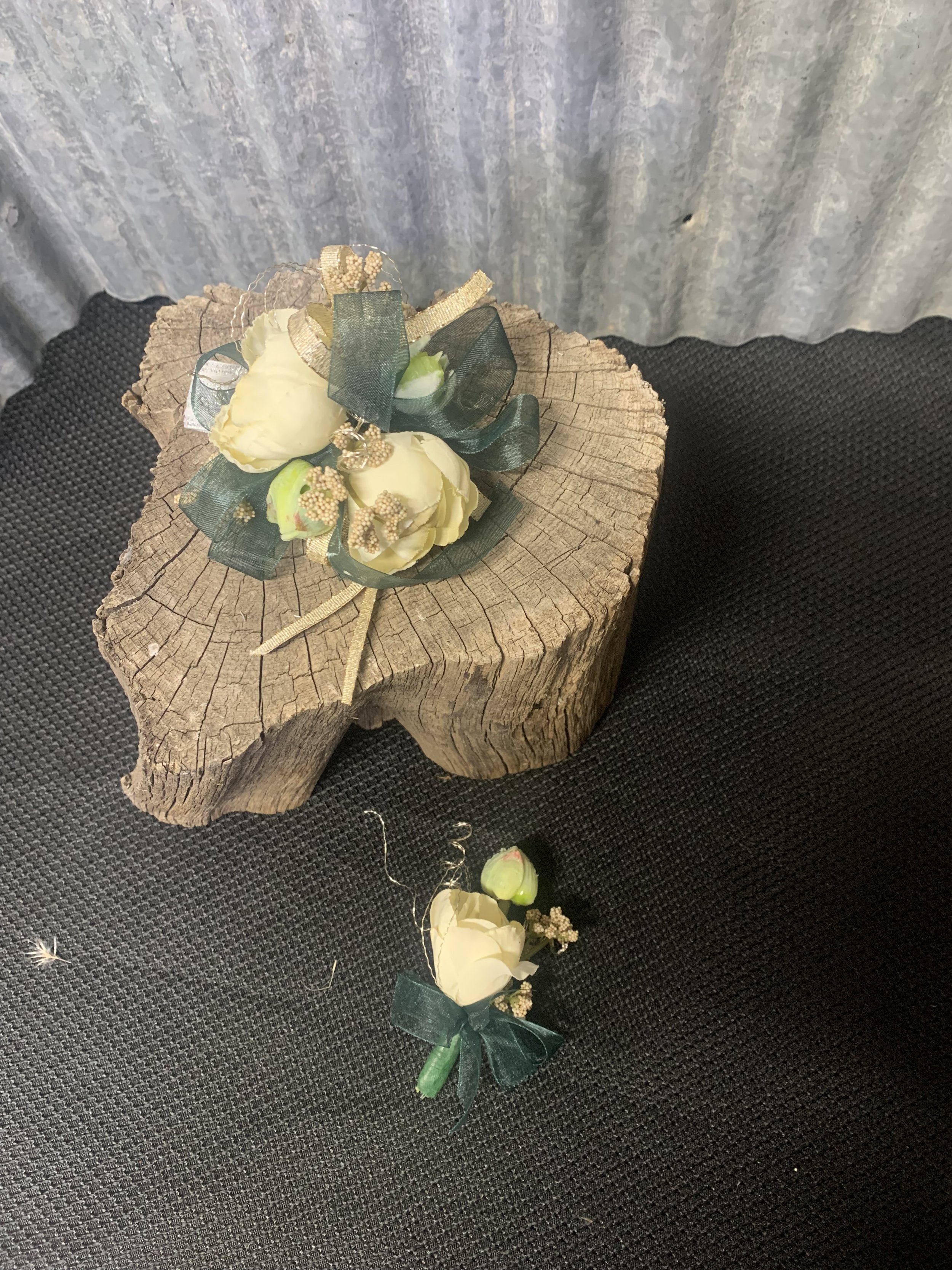 Prom Pretties › Emerald Corsage Image 1 of 1 Emerald Corsage $40.95 White flowers with emerald green and gold ribbon on a basic stretchy wristlet.Includes matching boutonniere. Add To Cart Added! White flowers with emerald green and gold ribbon on a basic stretchy wristlet.Includes matching boutonniere.